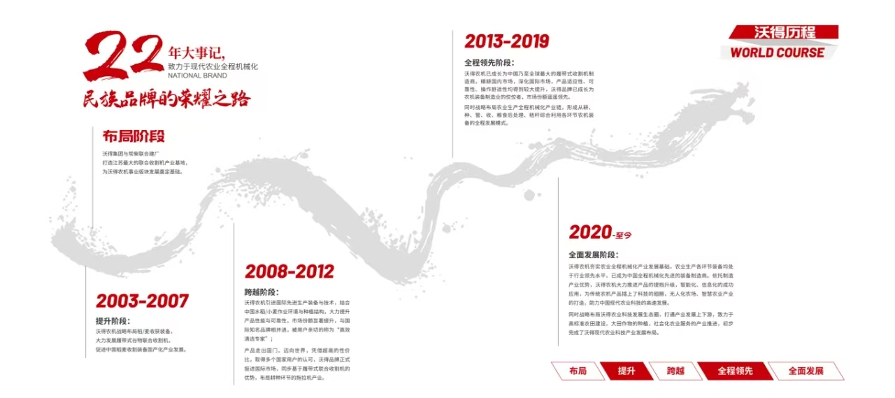 沃得農(nóng)機(jī)隸屬于中國(guó)民營(yíng)企業(yè)500強(qiáng)之一的江蘇沃得集團(tuán),占地面積3000余畝,員工8000余人,2016年實(shí)現(xiàn)銷(xiāo)售70億元人民幣,是一家集研發(fā)、生產(chǎn)、銷(xiāo)售、服務(wù)于一體的大型現(xiàn)代化農(nóng)機(jī)裝備制造企業(yè)。沃得農(nóng)機(jī)立足水田,致力于現(xiàn)代農(nóng)業(yè)全程機(jī)械化,歷經(jīng)近30年發(fā)展,產(chǎn)品形成以耕-種-田間管理-收獲-秸稈綜合利用-糧食后處理全系列產(chǎn)品線(xiàn)。依托優(yōu)質(zhì)的產(chǎn)品和誠(chéng)信的服務(wù),公司產(chǎn)品暢銷(xiāo)全國(guó)28個(gè)省市自治區(qū),出口至世界38個(gè)國(guó)家和地區(qū)。